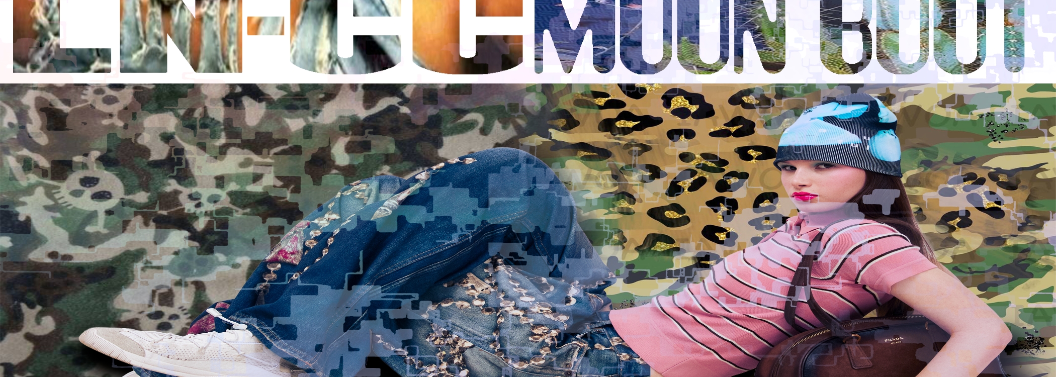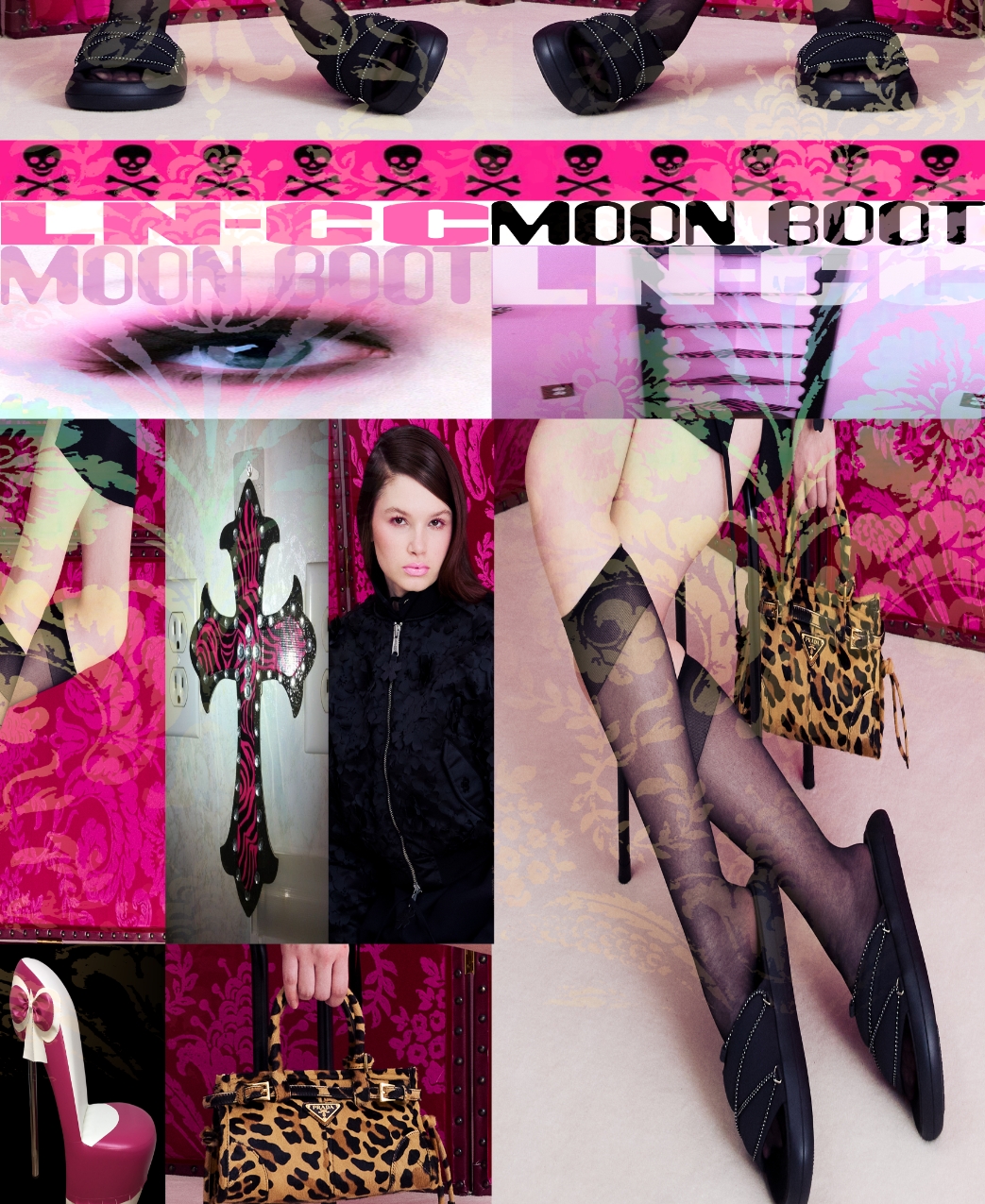 Featured amongst pink decor and animal print, the visual world in the imagery became creative material for Nola, forming collages that combine the shoot with found materials. With her work spanning a variety of media, most notably intimate paintings that evoke memories and a reflection on feminist thematics, Nola’s viewpoint on the world is best seen through her art. Being a bold display of self-referential storytelling, she has exhibited everywhere from her country of origin New Zealand, to New York, where currently resides. Here, Nola lends her artistic vision to collaging the Moon Boot shoot, situating the minimalist MB models within a fantastical sensibility. During the creation of the collages, Pippi spoke with LN-CC, detailing her process and the thoughts behind work.